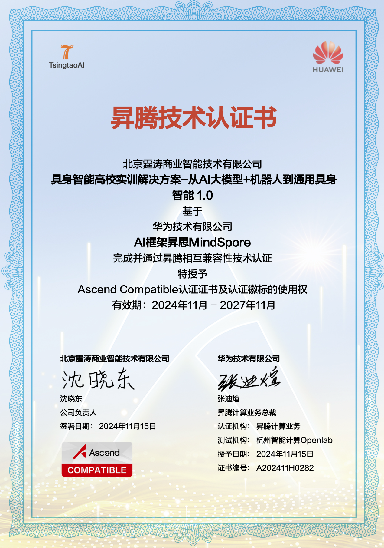 日前,该“具身智能高校实训解决方案-从AI大模型+机器人到通用具身智能”基于华为技术有限公司AI框架昇思MindSpore,完成并通过昇腾相互兼容性技术认证。