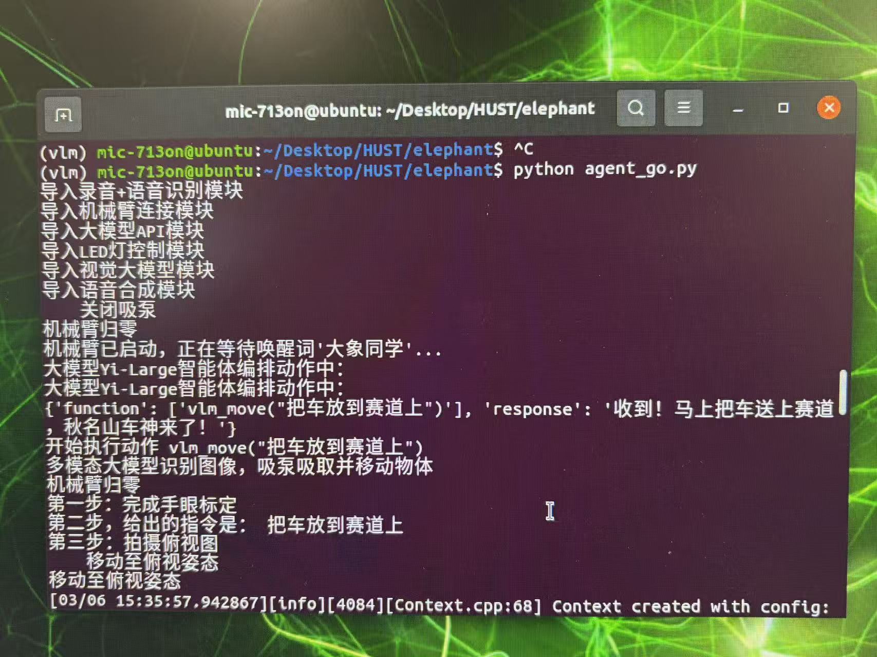 设计语音指令并编写指令解析代码,根据语音指令进行任务规划和动作执行,测试机械臂在自然语言指令下的动作反应;