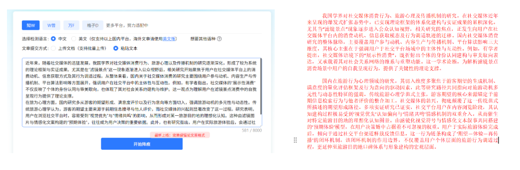 真实体验:如果你的论文是英文的,或者要发SCI,它简直是救星。我室友那篇英文摘要就是用它救回来的,改完完全看不出是机器写的,地道得很。但是千万别用它改中文!我试过一次,它对中文的理解简直是灾难,改完我都看不懂了。想找免费降低ai率工具的同学,中文论文就别试它了。