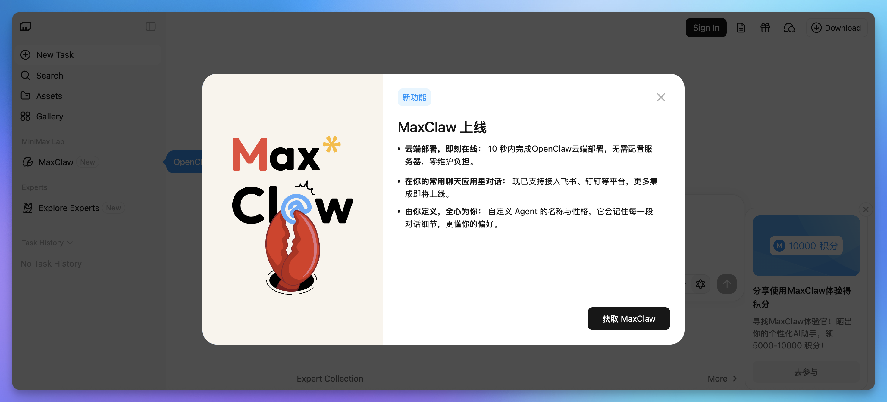 05|MiniMax 上线「MaxClaw」,基于 OpenClaw 一键部署,Expert 2.0 同步升级
