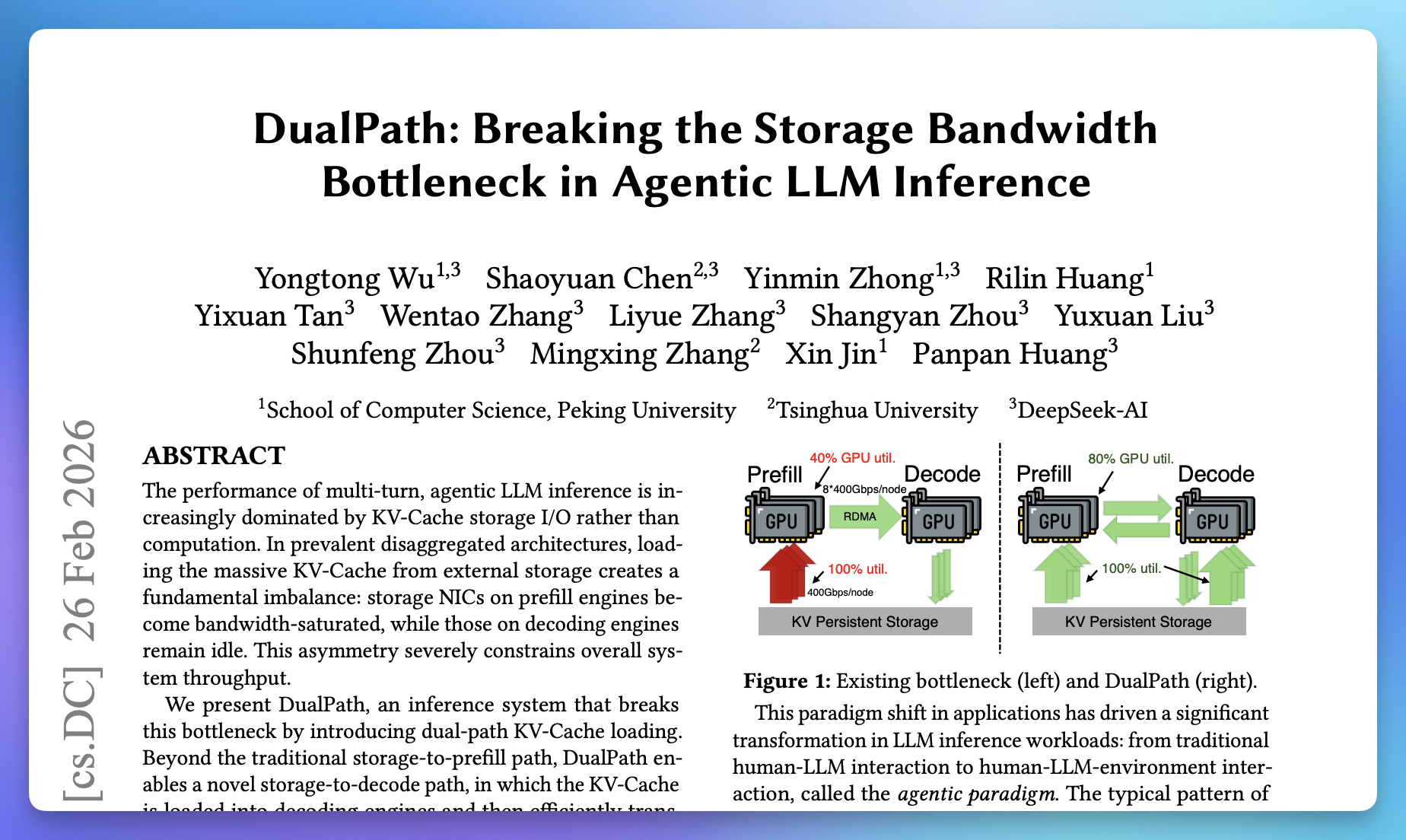 2️⃣ ⚡ DeepSeek 联合北大清华发布 DualPath :专攻 Agent 多轮对话场景下的 KV-Cache 瓶颈,基于 DeepSeek V3.2 实测吞吐量最高提升 1.96 倍,仅约 5000 行代码改动。