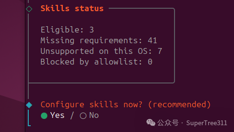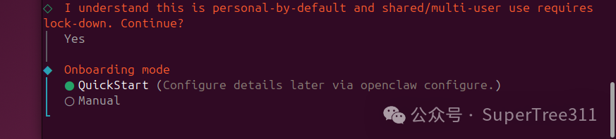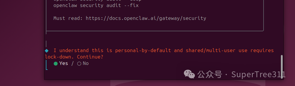 由于 OpenClaw AI代理会控制您的计算机系统,因此它可以读取您的敏感文件并管理浏览器数据。系统会显示“安全免责声明”。请使用键盘选择“是”,然后按 Enter 键以确认风险并继续。