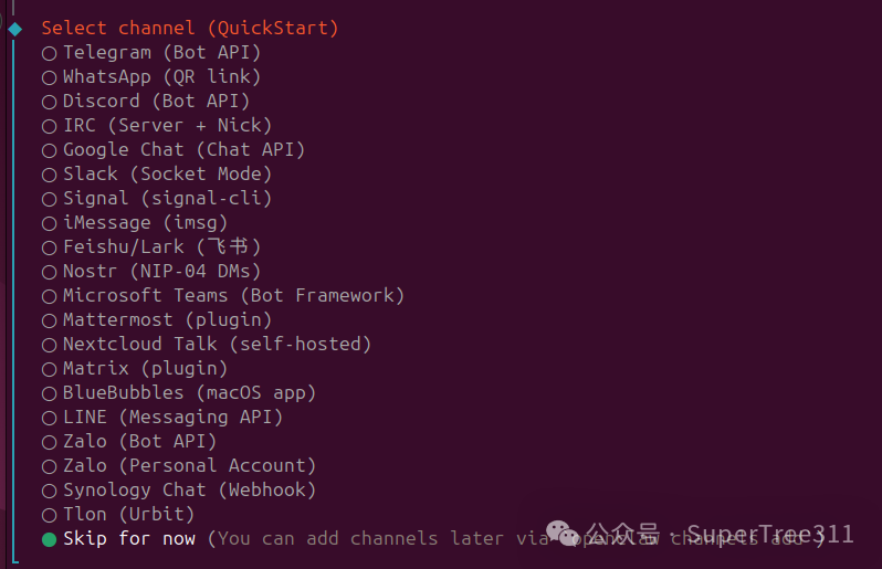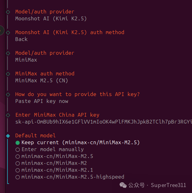 您可以将 OpenClaw 想象成一个有手有脚(用于浏览器和系统控制)但没有大脑的机器人。在此步骤中,您需要选择一个特定模型的“大脑”,例如国内的Minimax、Moonshot 等。我选择MiniMax,然后按Enter 键,可以先选 Skip for Now以后再设置。