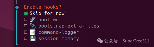 系统会提示您启用钩子功能,该功能用于高级日志记录和外部集成。暂时选择“跳过”。