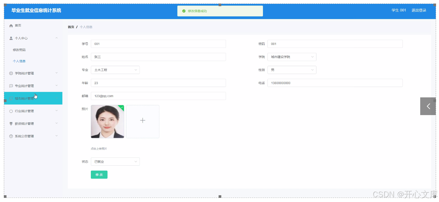 With the development of mobile application technology, more and more students complete their life affairs with the help of mobile phones and computers. Many industries also pay more attention to the combination with the Internet, so as to improve the speed, efficiency and security, and help more people in need. Aiming at the problem of traditional graduate employment information statistics system, combined with the actual needs of students, this course designs the graduate employment information statistics system, Students can use this system to realize graduates' employment information. The administrator will audit the graduates' employment information through the background. The administrator can also carry out home page, personal center, student management, college information management, professional information management, industry information management, college statistics management, professional statistics management, city statistics management, industry statistics management and salary statistics management , system announcement management, student; home page, personal center, college statistics management, professional statistics management, city statistics management, industry statistics management, salary statistics management, system announcement management and other operations. Compared with the traditional manual recording method, the development of this system is not only convenient for students, but also improves the efficiency of managers.