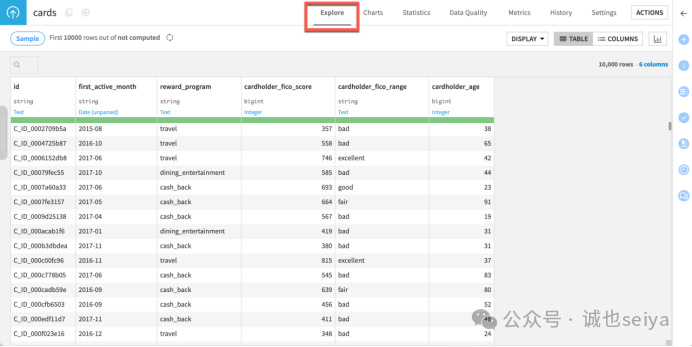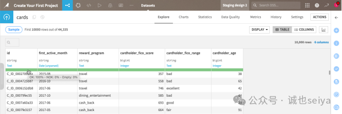 4.Dataiku 会显示 cards 数据集的预览。如你所见,数据呈表格格式,包含列(特征)和行(记录或观测值)。Dataiku 已根据文件名自动将数据集命名为 cards