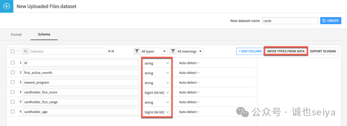 6.在 Schema(架构) 选项卡中,点击 Infer Types From Data(从数据中推断类型),然后点击 Confirm。这样Dataiku 就会根据当前样本尝试推断正确的存储类型。