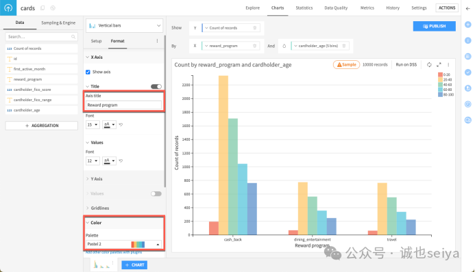 将cardholder_age 拖至颜色(水滴图标)字段。