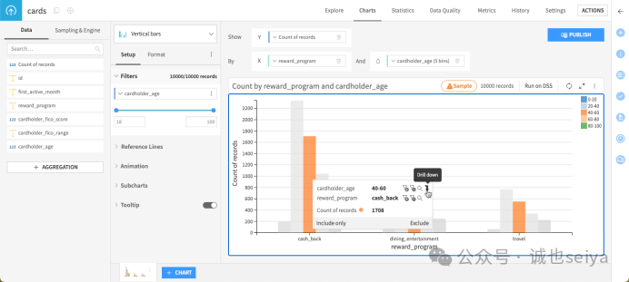 4.下钻探索(Drill down):鼠标悬停在橙色柱子(40-60 岁)上,点击出现的下钻图标(向下箭头),这会自动在左侧 Setup > Filters 中添加一个过滤器。