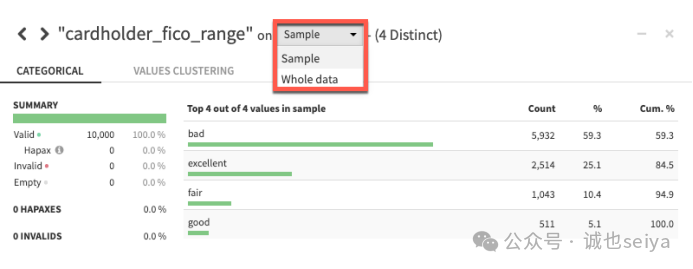 2.分析全量数据:在列名旁的下拉菜单中将“Sample”改为 Whole data,然后点击 Save and Compute。使用列名旁的箭头可以快速切换至相邻列。