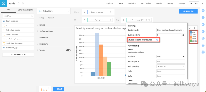 3.优化分组:在 cardholder_age 变量的下拉菜单中,勾选 Adjust bin size for nicer bounds,使年龄分布更美观。