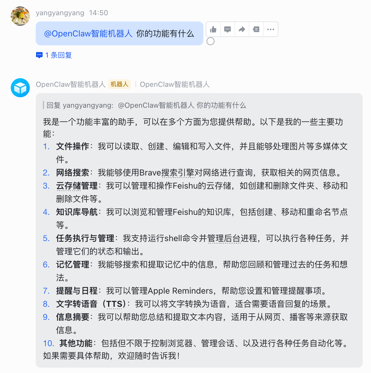 可以看到飞书机器人正常回复,下面开始尽情探索吧!