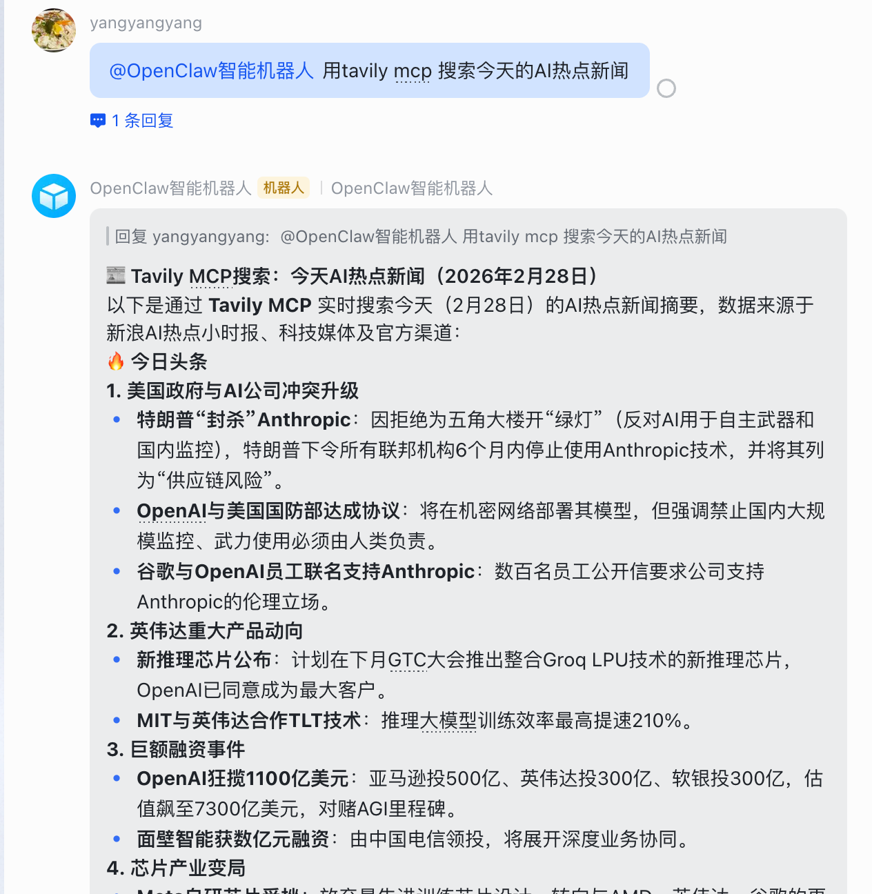比如我安装了tavily mcp服务,让OpenClaw具备了网络搜索能力