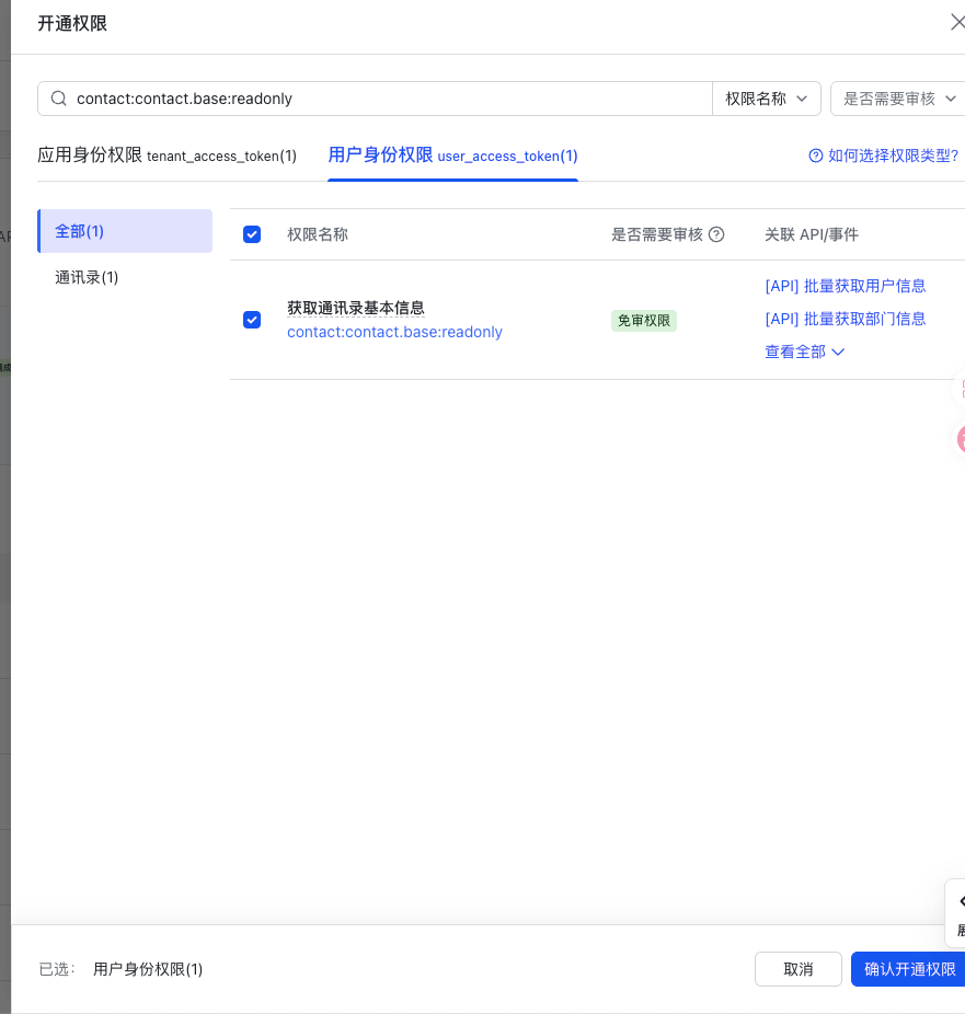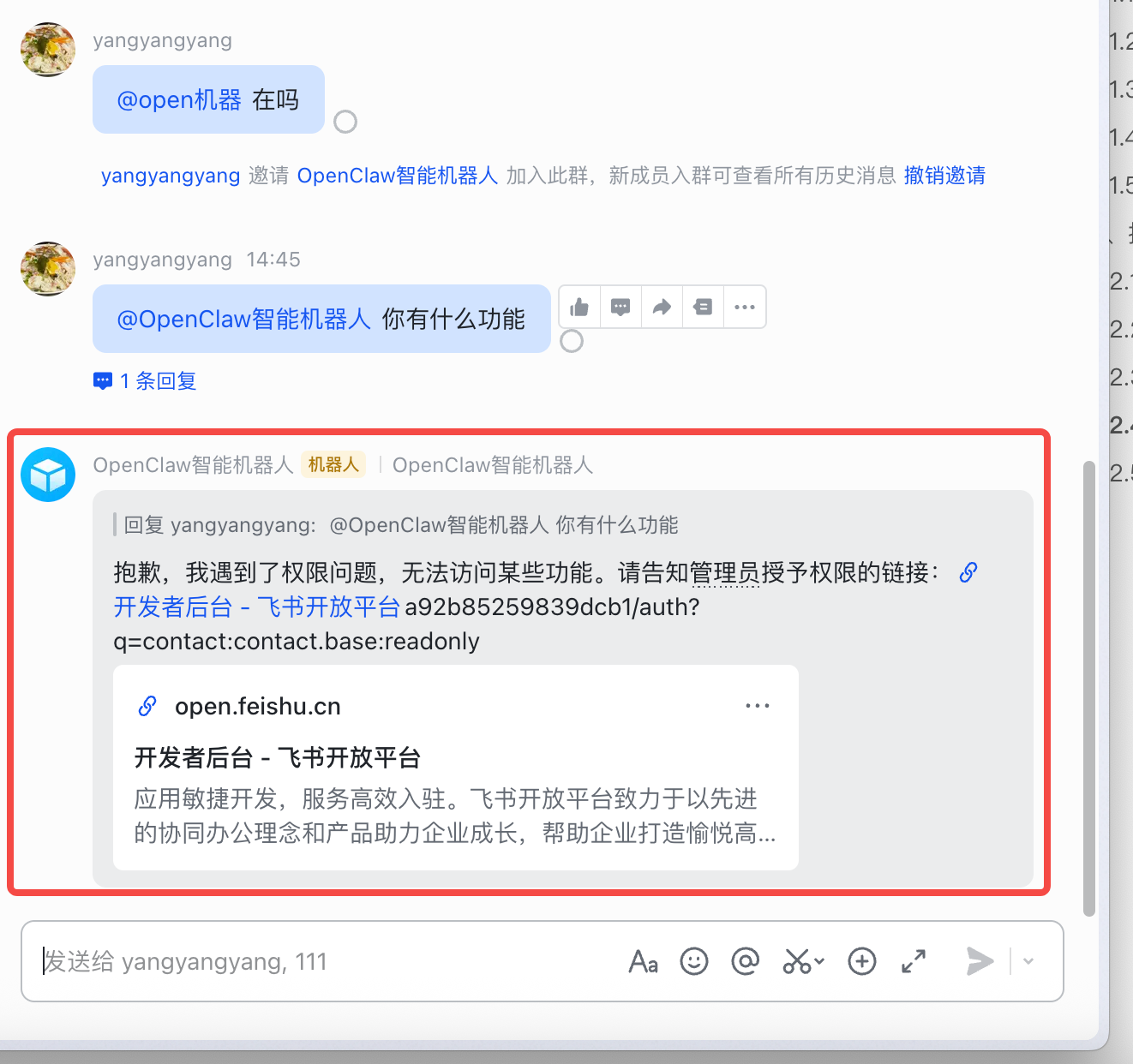 打开飞书群聊-设置-群机器人-搜索到刚发布的机器人,群里@机器人会提示授权,复制该链接,增加用户身份授权 ,授权链接https://open.feishu.cn/app/你的机器人APPID/auth?contact:contact.base:readonly