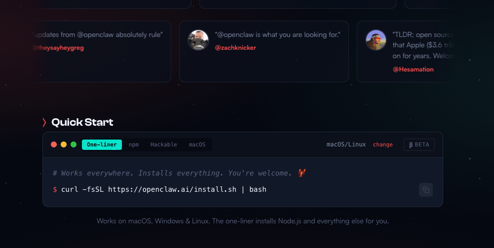 进入 OpenClaw 官网 https://openclaw.ai/ ,我们通过下面的一行安装命令进行安装
