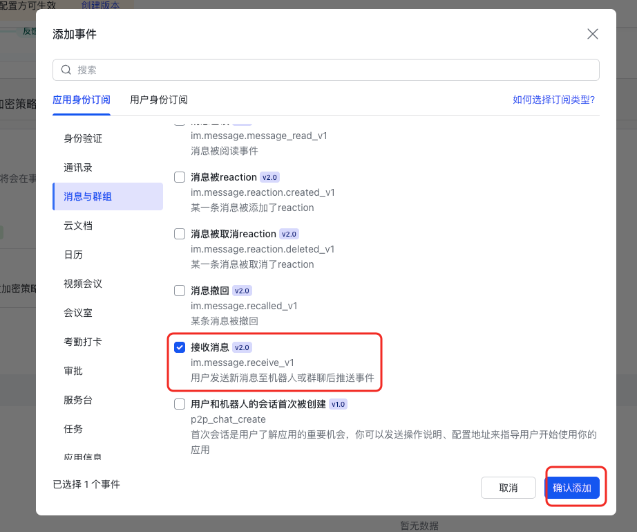 权限配置 - 步骤2 添加接收消息事件