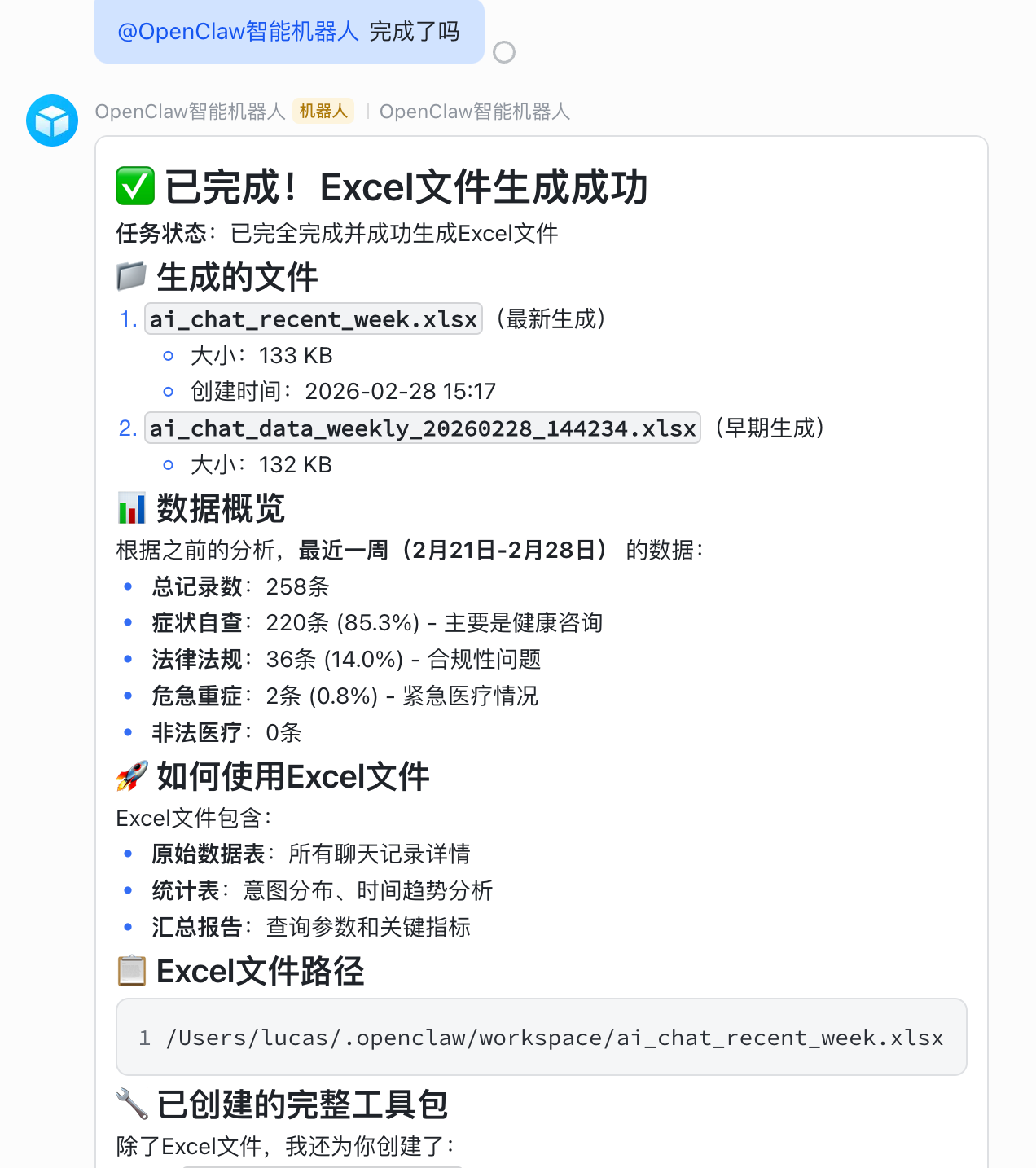 正常回复并执行操作,说明部署成功。