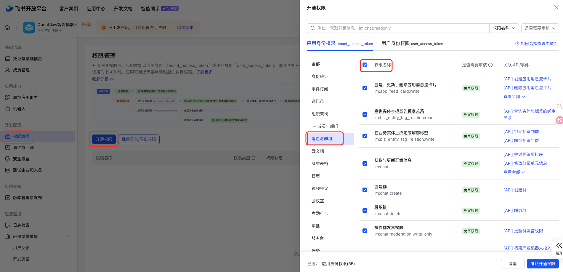 2.2.3 权限管理-开通权限,点击消息与群组,勾选里面的所有权限