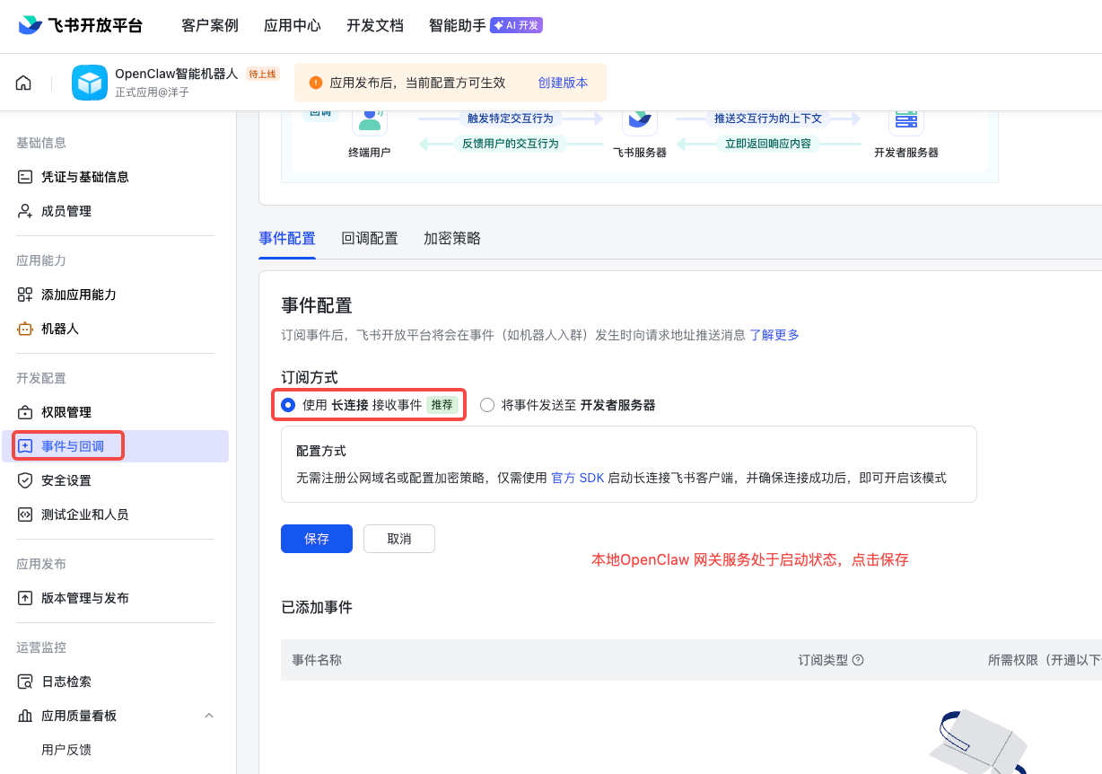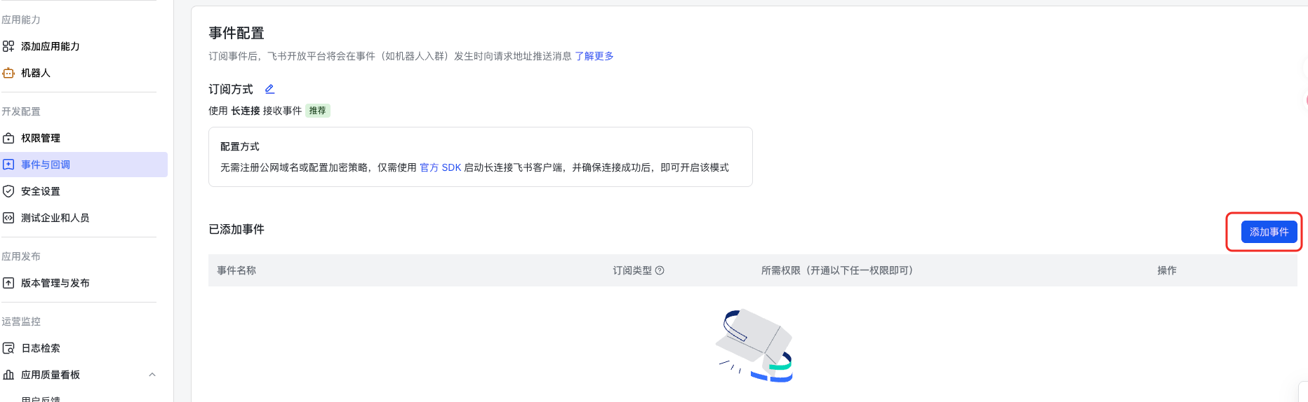 回到飞书开放平台,为应用添加必要的权限和事件订阅。