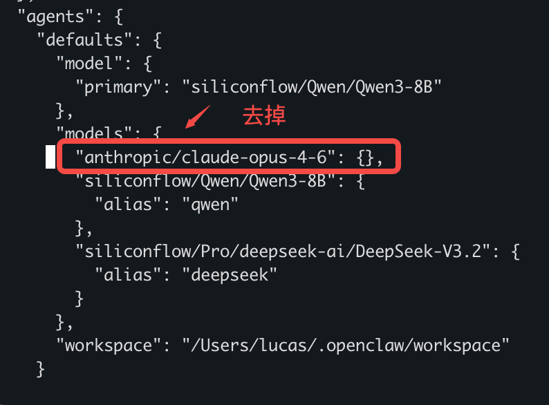 - 查看配置文件~/.openclaw/openclaw.json有多余的模型,原因是初始化步骤Default model选择的默认模型,可以手动去掉后,重启网关(openclaw gateway restart)