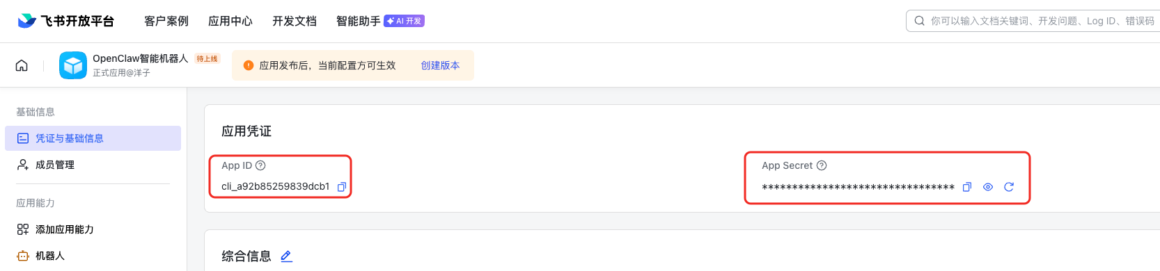 2.2.4 找到凭证与基础信息,复制 App ID 和 App Secret,这两个值后面配置 OpenClaw 时要用到,务必保存好。