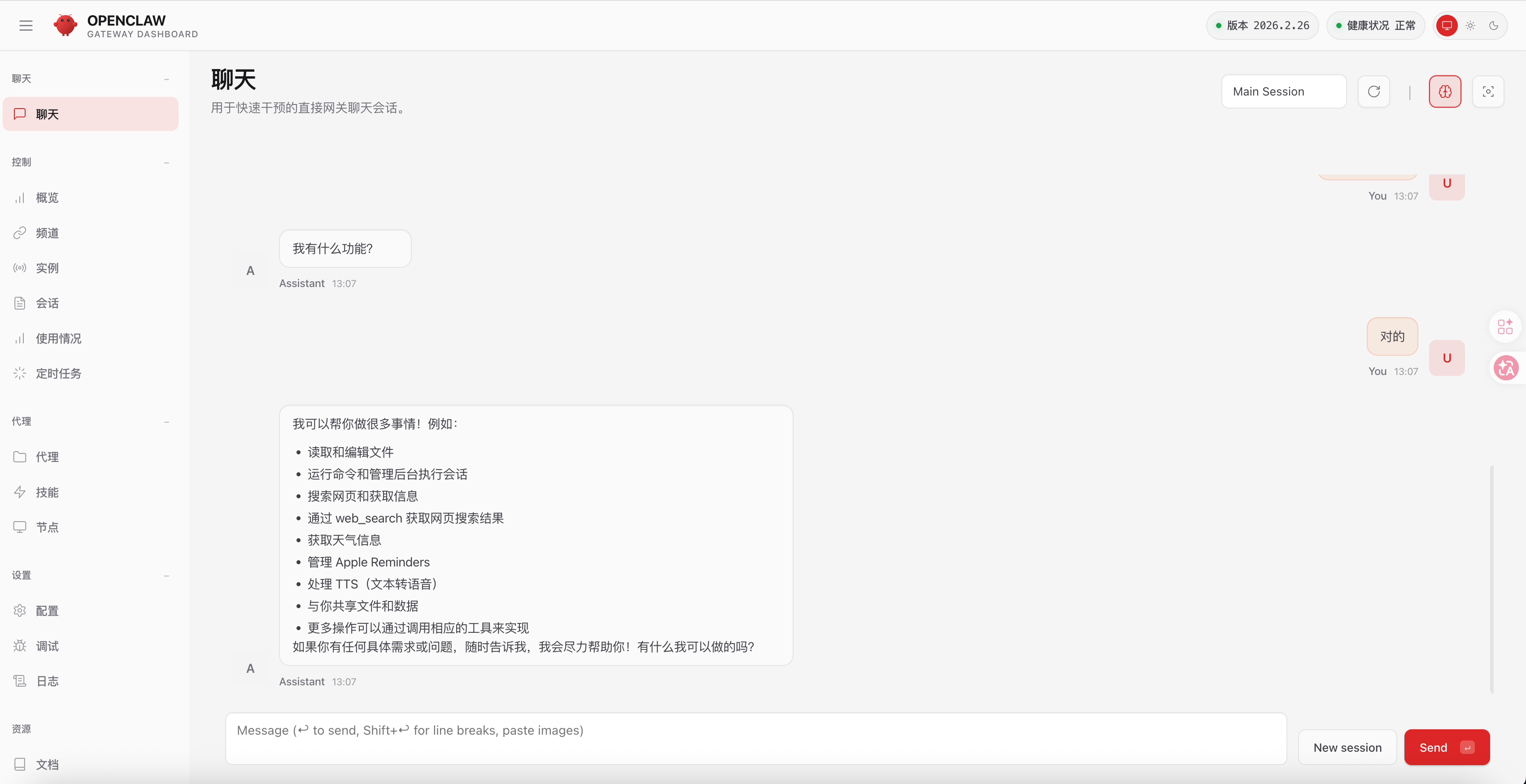 在仪表盘聊天框输入指令,测试基础能力: