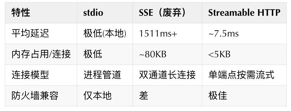 远程场景 → 选Streamable HTTP,延迟低(~7.5ms),防火墙友好