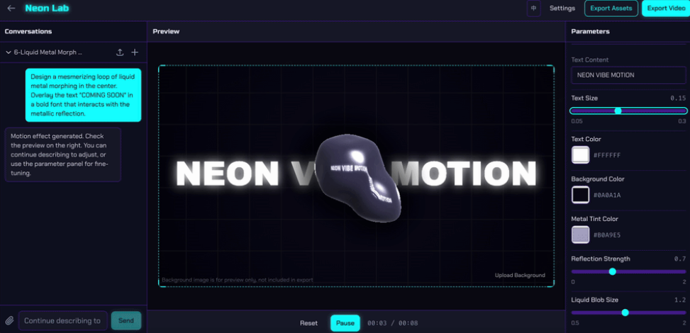 Neon是首个开源的、支持实时参数控制的AI动态设计工具(参考Higgsfield对Vibe Motion的定义;如果此声明不准确,请开Issue,我会立即更正)。