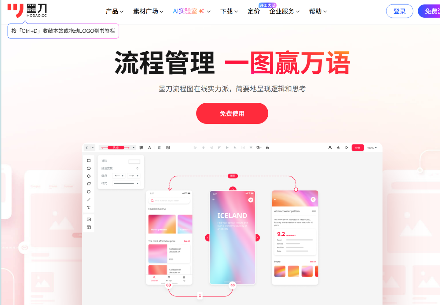 墨刀流程图是墨刀平台推出的专业工作流程图生成器,依托墨刀在原型设计领域的优势,主打产研团队流程梳理,适合产品经理、研发人员、设计师制作业务流程、用户旅程、系统逻辑流程图,是我在产研项目中常用的工具。