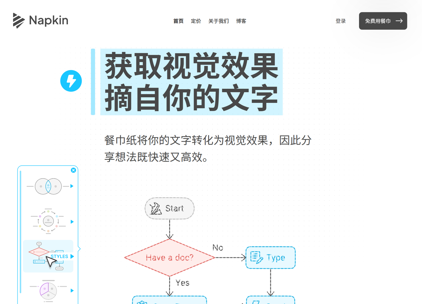 Napkin 是一款海外热门的 AI 驱动工作流程图生成器,主打 “文字一键变图表”,核心定位是让想法快速可视化,不仅能制作工作流程图,还能生成思维导图、信息图、时间轴等多种可视化内容,适合追求创意与效率的用户。