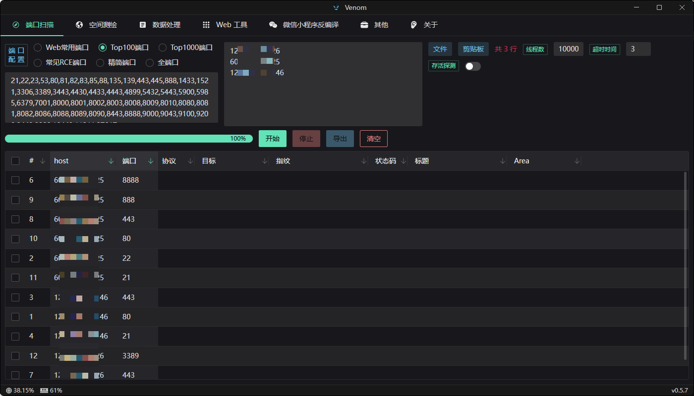 极速端口扫描:将测绘结果直接导入扫描引擎,开启多线程探测。支持自定义端口组(如企业内网 Top100 端口),实时监控扫描进度与存活状态 。