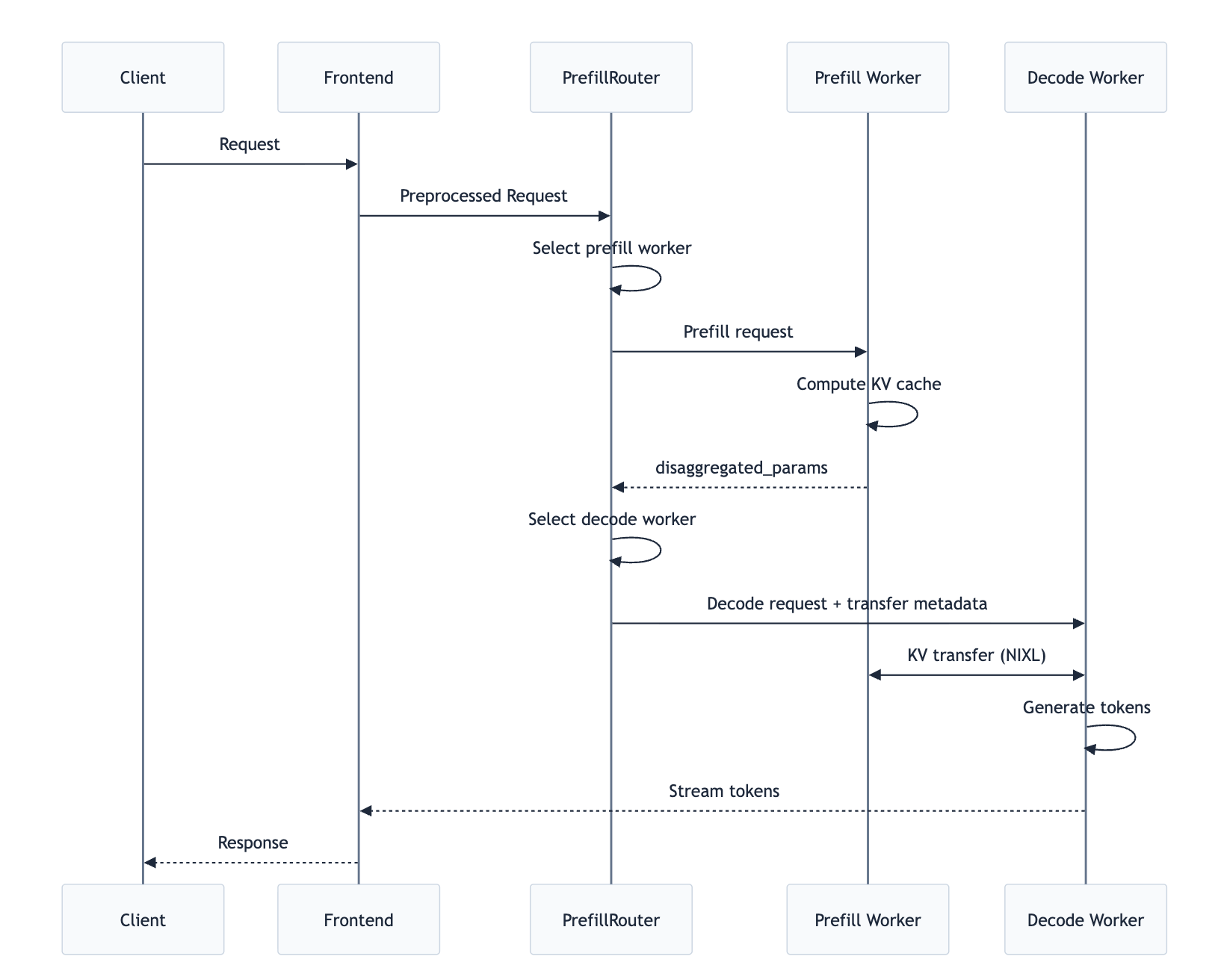 disaggregated_params(包含后端特定的传输元数据)。 - Decode 路由:PrefillRouter 将 Prefill 结果注入 Decode 请求,然后路由到 Decode Worker。