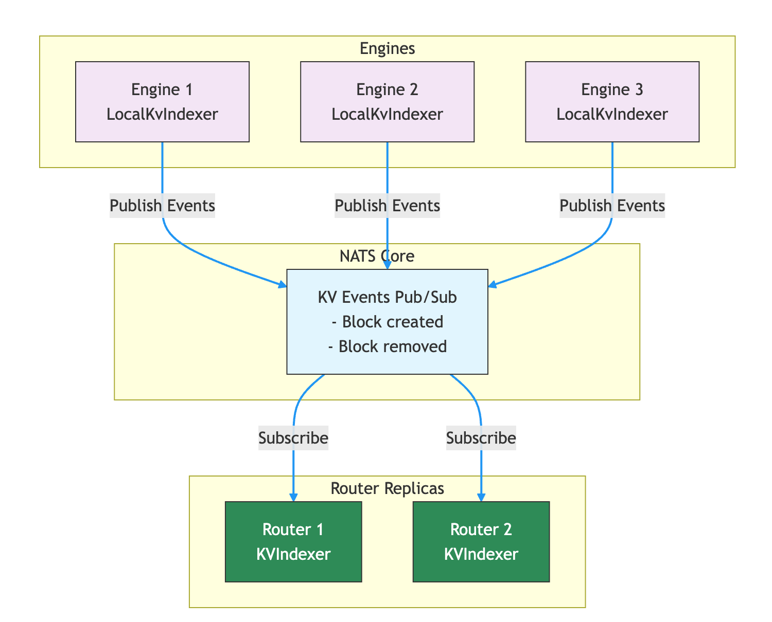 - Local Indexer 模式(默认):Worker 通过 NATS Core 或 ZMQ 发布 KV 事件,Router 接收事件后更新自身索引。由于 NATS Core 不持久化消息,如果 Router 重启或短暂掉线导致事件丢失,Router 会主动查询 Worker 本地的 LocalKvIndexer(Radix Tree)恢复缺失状态。更轻量,不依赖 JetStream。