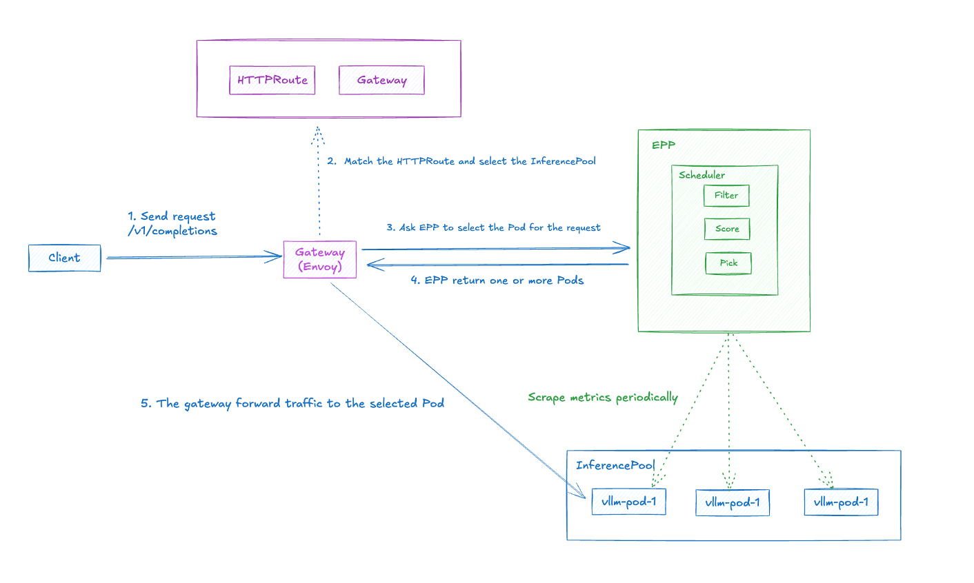 scheduler: {} # Kserver 自动创建 InferencePool + EPP Scheduler