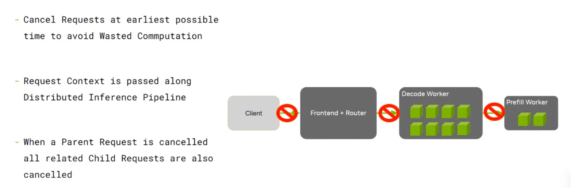 - KV Cache 传输:Decode Worker 使用传输元数据与 Prefill Worker 协调,NIXL 使用最优的可用传输方式(NVLink、InfiniBand/UCX 等)处理 GPU-to-GPU 的直接传输。