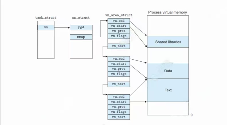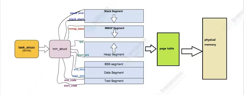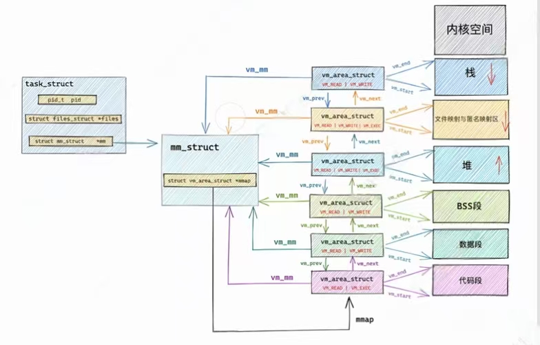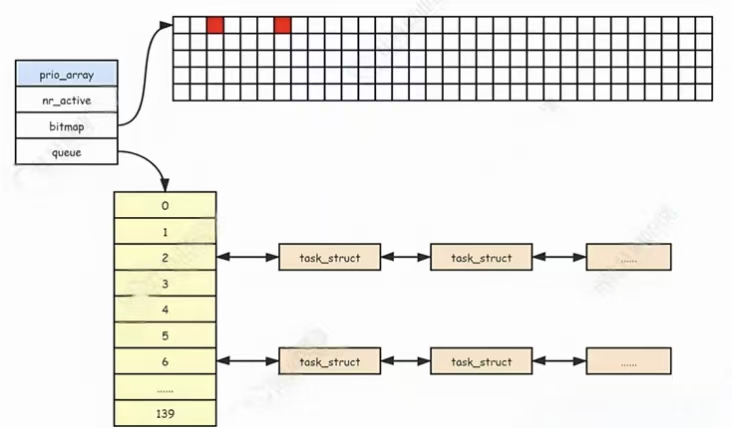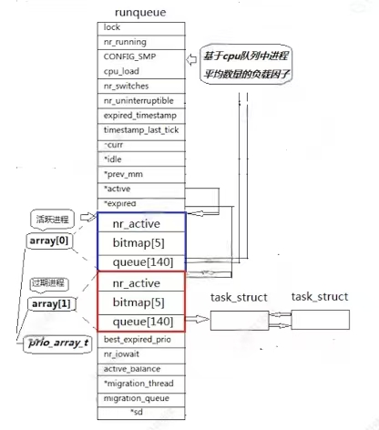 可在linux内核源代码中找到task_struct进程控制块,所有在系统中运行的进程都以task_struct双向链表的形式存在内核里,如下图所示: