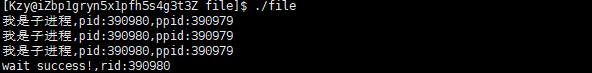 父进程通过wait(NULL)等待子进程退出,若子进程未退出,则父进程会一直阻塞等待,直到子进程退出,3s后子进程exit退出,父进程通过wait返回,获取子进程退出信息,并进行子进程的回收,等待成功,结果如下: