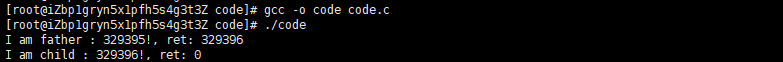 ret==0即为子进程,反之则为父进程,运行结果如下: