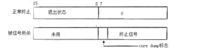 wait和waitpid,都有一个status参数,该参数为输出型参数,由操作系统填充,如果传NULL,则表示不关心子进程的退出状态信息,否则,操作系统将根据该参数,将子进程的退出信息反馈给父进程。status不能简单的当作整形来看待,须当作位图来处理,具体细节见下图,只研究status的低16比特位,status的位图结构如下所示: