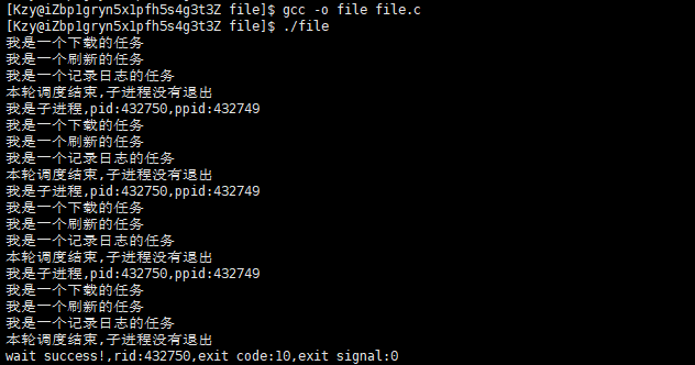 父进程通过waitpid(id,&status,WNOHANG)非阻塞等待子进程,WNOHANG表示非阻塞等待,父进程非阻塞轮询子进程,rid为0时,子进程仍在运行,与此同时父进程通过函数指针回调的方式来执行任务队列,当rid>0时,子进程退出,父进程获取子进程的退出信息并退出,结果如下所示: