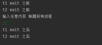 System.out.println("输入任意内容 唤醒所有线程");