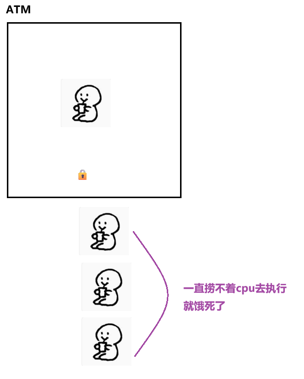 线程ABCD到ATM机器取钱 A先进入ATM机上锁 此时发现ATM机器已经没钱了 只能等运钞机来放钱进入ATM机 但是A此时不想走也不想给别人抢先等 所以A出来等锁 其它线程不知道啥情况一直死等