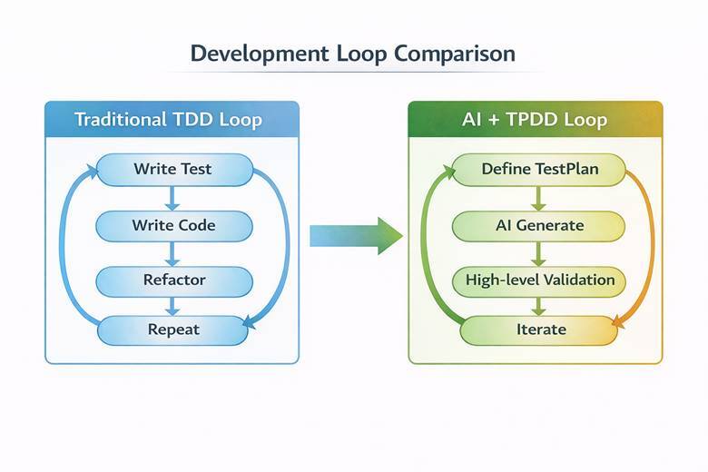 (图注:开发循环对比图。左侧传统的 TDD 循环(写测试->写代码->重构)已被 AI 替代;右侧是新的 AI+TPDD 循环,人类退守到高层的“定义测试计划(Define TestPlan)”与“高层验证(High-level Validation)”,中间的代码生成由 AI 完成。)
