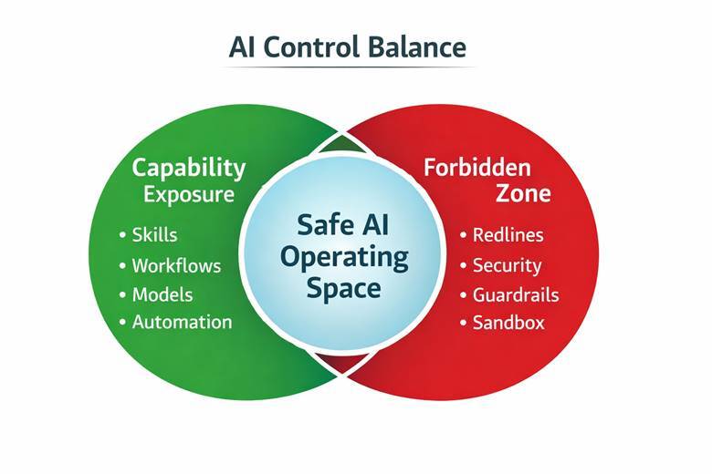 (图注:AI 控制平衡图。真正的安全 AI 操作空间,必须建立在“能力暴露(绿区:能做什么)”与“禁止空间(红区:绝对不能做什么)”的交集之上。当前多数团队严重偏向绿区而忽视红区。)