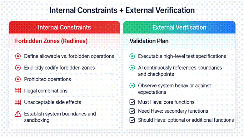 (图注:TestPlan.md 的两大核心作用:左侧为“内部限制(红线与禁止区域)”,右侧为“外部验证(基于 Must/Need/Should 优先级的测试计划)”。)
