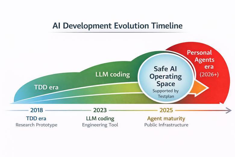 (图注:AI 开发演进时间轴:从早期的 TDD 时代,到 LLM 辅助编码,再到如今由 Testplan 支撑的“安全 AI 操作空间”与个人智能体时代。)