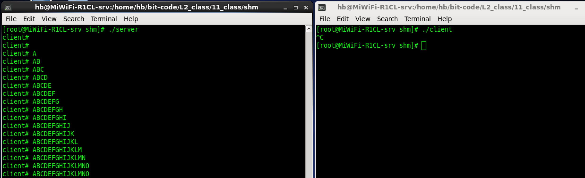 运行结果:服务端会实时打印客户端写入的内容,从 A 逐步到 Z,写入完成后,服务端销毁共享内存,程序退出。