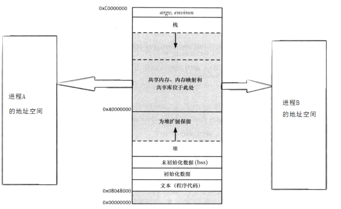 在 Linux 进程的 32 位虚拟地址空间中,共享内存、内存映射、共享库都位于0x40000000~0xC0000000的区域(堆和栈之间),这块区域专门用于映射内核管理的共享资源。
