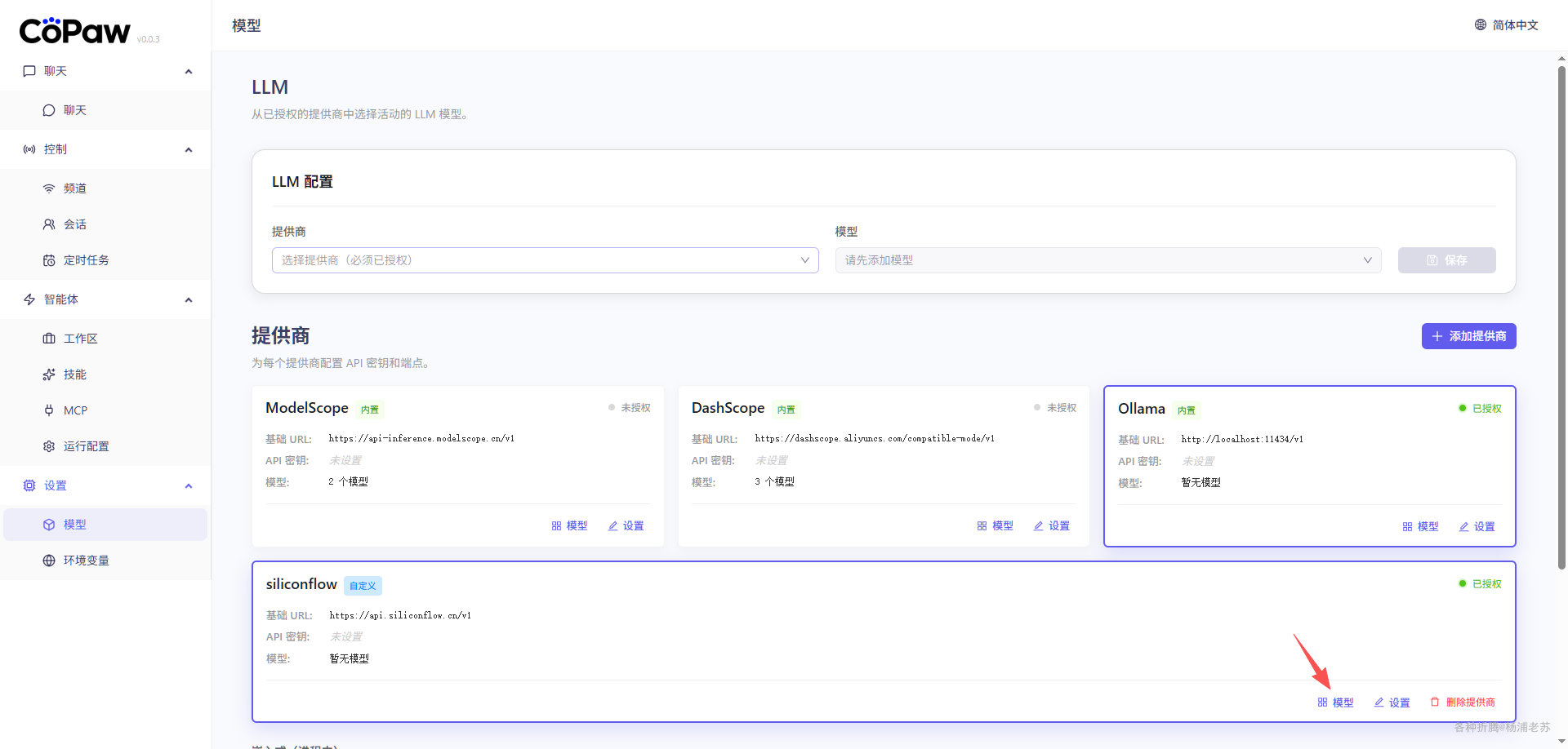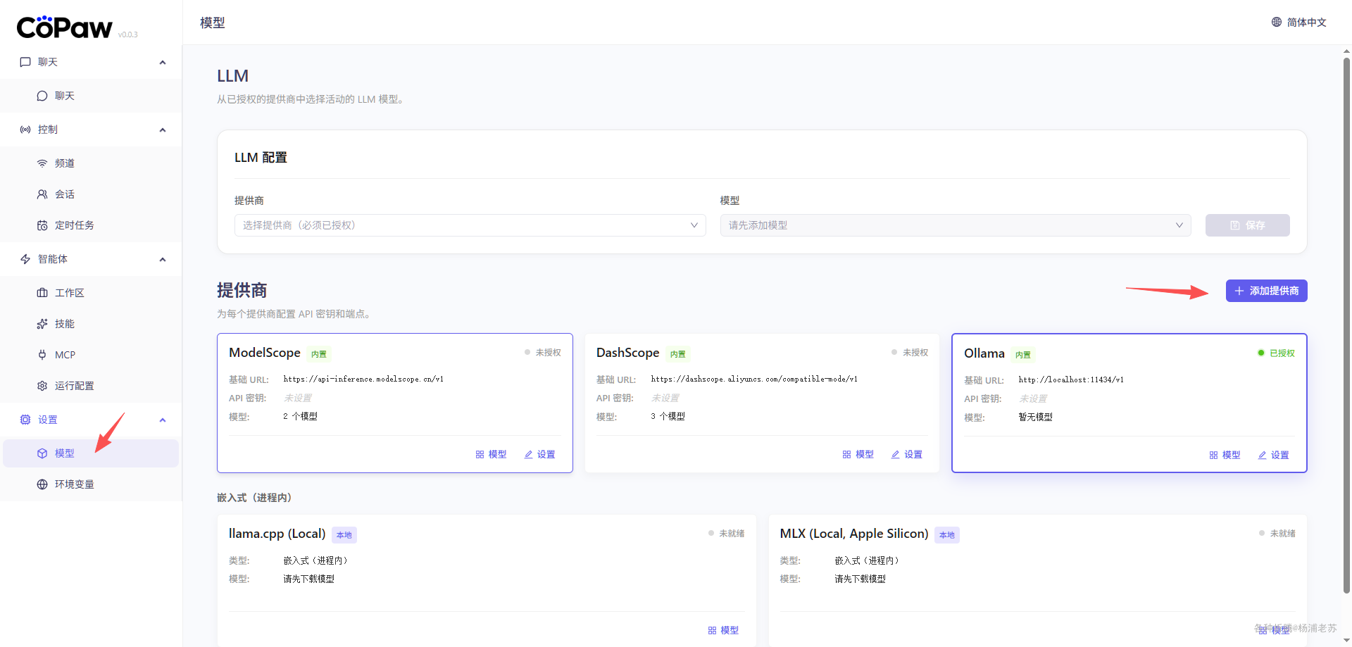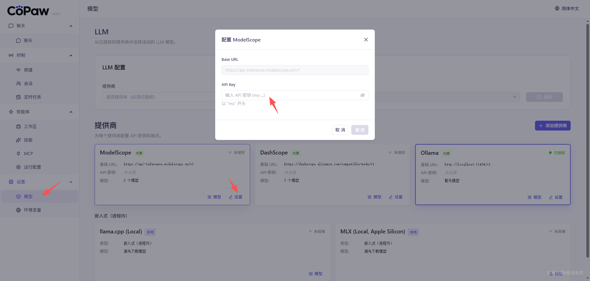 设置 --> 模型 ,如果你有魔搭的 API Key,可以直接设置