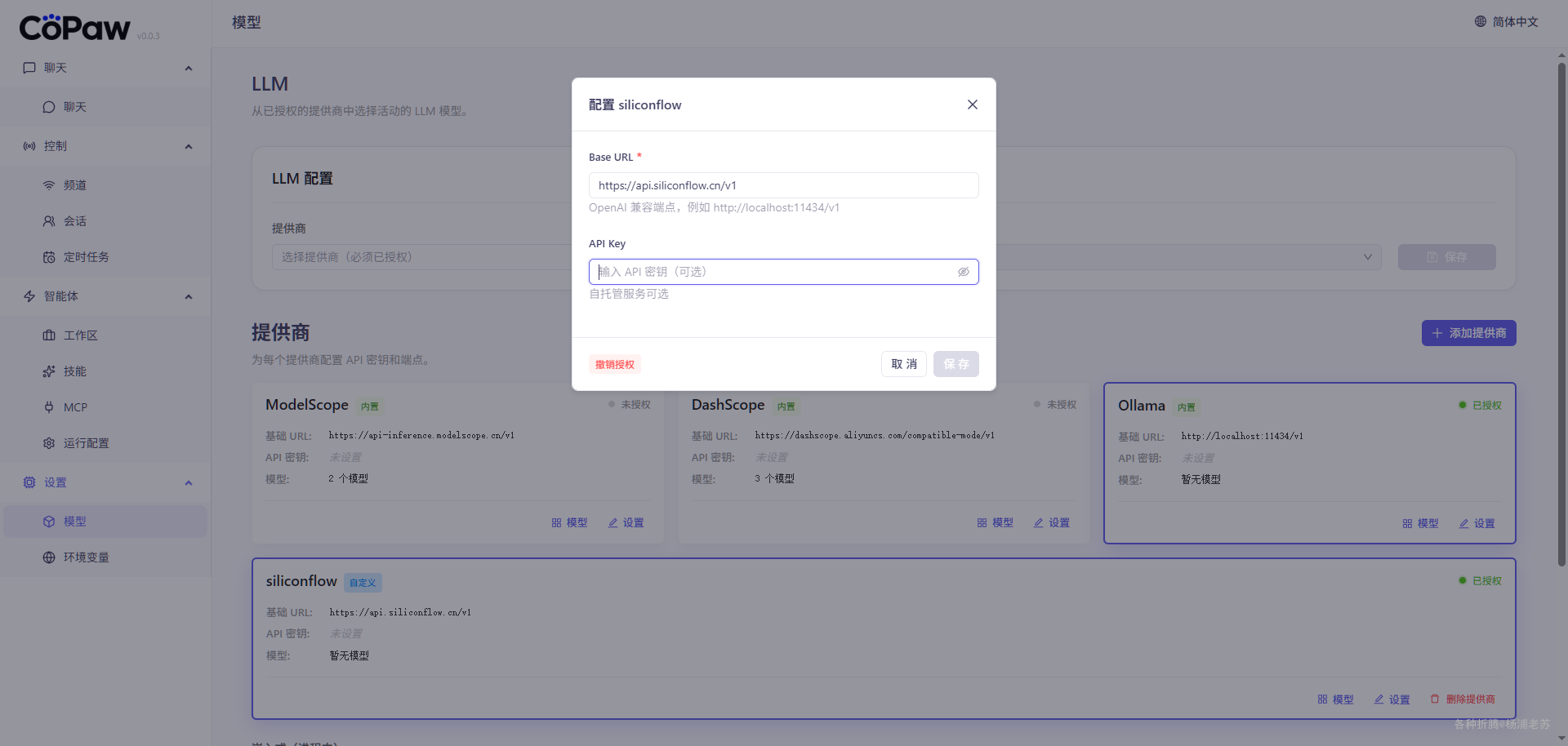 在开始对话前必须配置 API Key。未配置有效 Key 前,CoPaw 是无法正常工作的